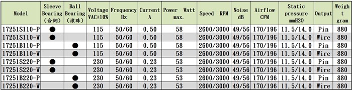 | Bearing軸承:Sleeve or Ball types 含油銅質或滾珠 |
