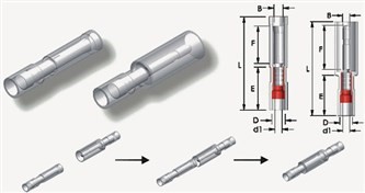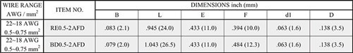 產品說明:1.最大伏特:300 伏特2.最高溫度:105°C3.端子材質:青銅4.電鍍:鍍錫5.銅套種類:D銅套6.絕緣材質:NYLON 尼龍產品規格:公端BD0.5-2AFD 母端RE0.5-2AFD