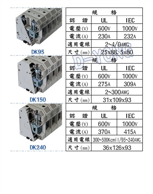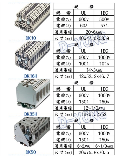 DK系列為在TS-32及TS-35上使用的端子台,採用壓線框接線,耐振動、防鬆脫,接觸面積大,產品信賴性高。本系列提供1.5mm2~240mm2的接線範圍,外型設計力求整齊一致,使設計整齊明瞭、美觀,可搭配適合的短路片及標示牌,產品的設計符合IEC60947-7-1 及 UL1059 等國際標準,並取得CUL、UL、VDE等認證。 DK系列下各型號之功用如下: DK:為2個接點共點之軌道式端子台,其饋線設計為一進一出之迴路。
