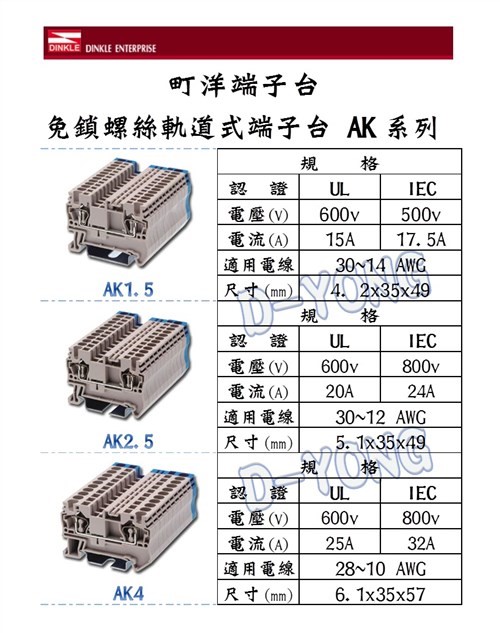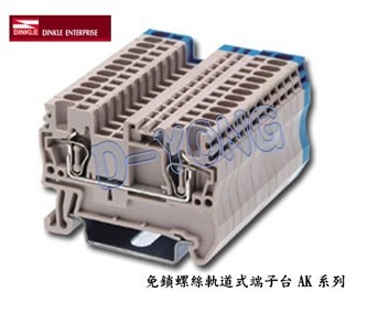 AK系列免鎖螺絲式端子臺產品特色回拉式彈簧夾:操作簡單、方便快速、省時高效、夾線力強、抗震防鬆脫、配合高純度導電板,達到低阻抗與高傳導接線要求,接線範圍:1.5~35mm2線徑。全系列各型式:一對一、一對二、二對二、雙層接線型、接地型,各式配件完整,不論橋接、區隔、標示,都有相對應配件可供選購使用,滿足配線標示需求。